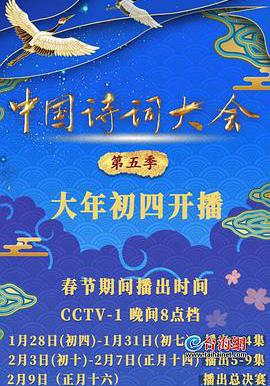 中国诗词大会 第五季 2020-01-28 综艺 加载中 ... 第10集 第09集 第08集 第07集 第06集 第05集 第04集 第03集 第02集 第01集 更新至 第10集 中国诗词大会 第五季 7.2 又名: 导演: 颜芳演员: 龙洋 / 王立群 / 康震 / 蒙曼 / 杨雨类型: 真人秀制片国家/地区: 中国大陆年份: 2020 简介: 《中国诗词大会》第五季于2020年春节期间在央视综合频道黄金时段播出。节目共十期。《中国诗词大会》是央视首档全民参与的诗词节目,节目以“赏中华诗词、寻文化基因、品生活之美”为基本宗旨,力求通过对诗词知识的比拼及赏析,带动全民重温那些曾经学过的古诗词,分享诗词之美,感受诗词之趣,从古人的智慧和情怀中汲取营养,涵养心灵。 相似视频: 中央广播电视总台2019主持人大赛 (2019)